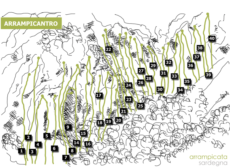 | 20 | Correnzo | 5b | 15 | ●●○○○ | Pusceddu | 2007 | spigolo strapiombante su grosse prese, nella parte alta ci si può collegare a Fanciobi |